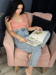 Dark haired hottie Sofi Li strips off her clothes while sitting on the chair