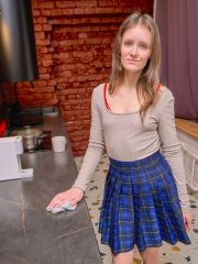 Skinny brunette MILF Elisa Swan strips off her red lingerie in the kitchen